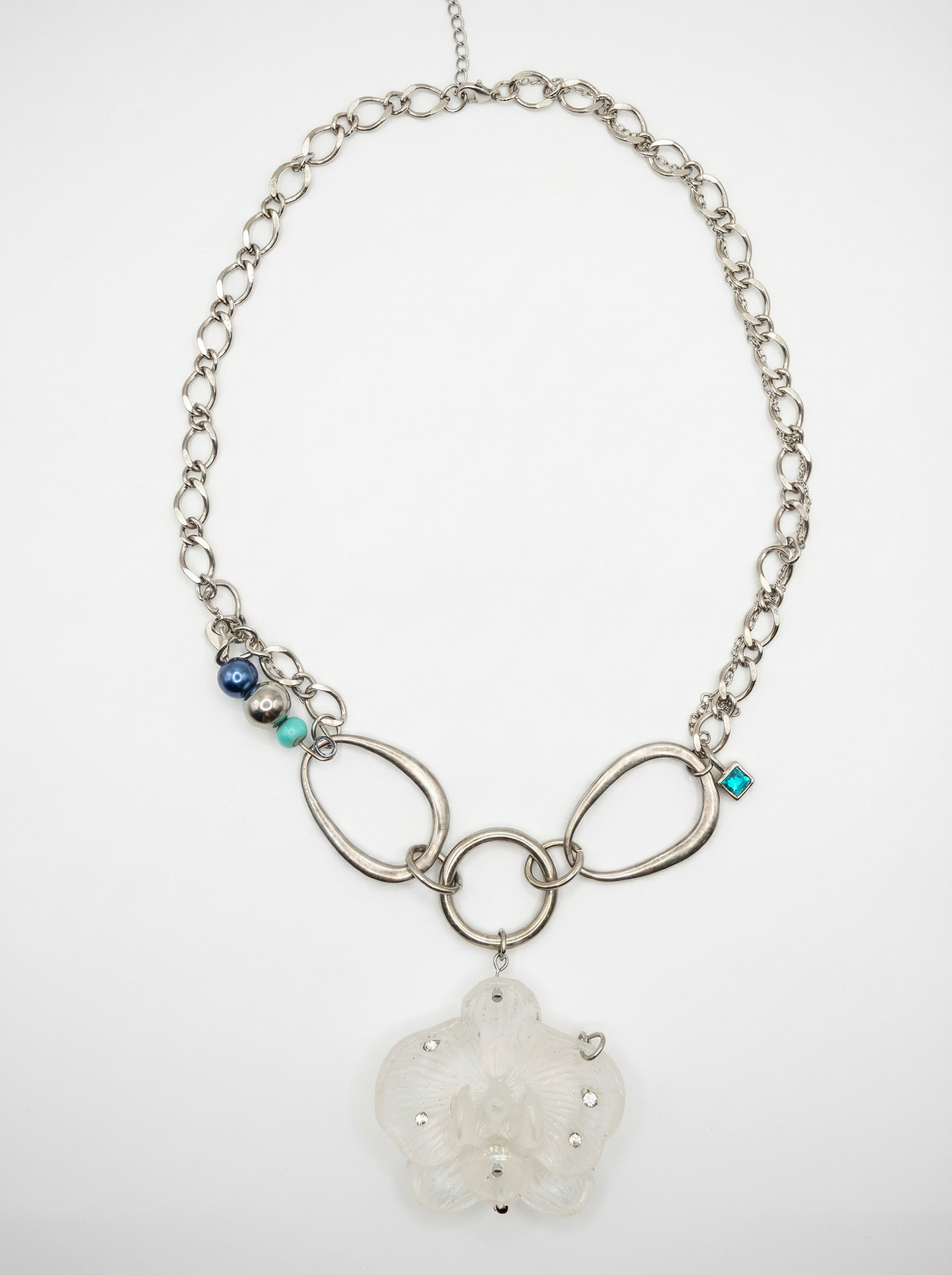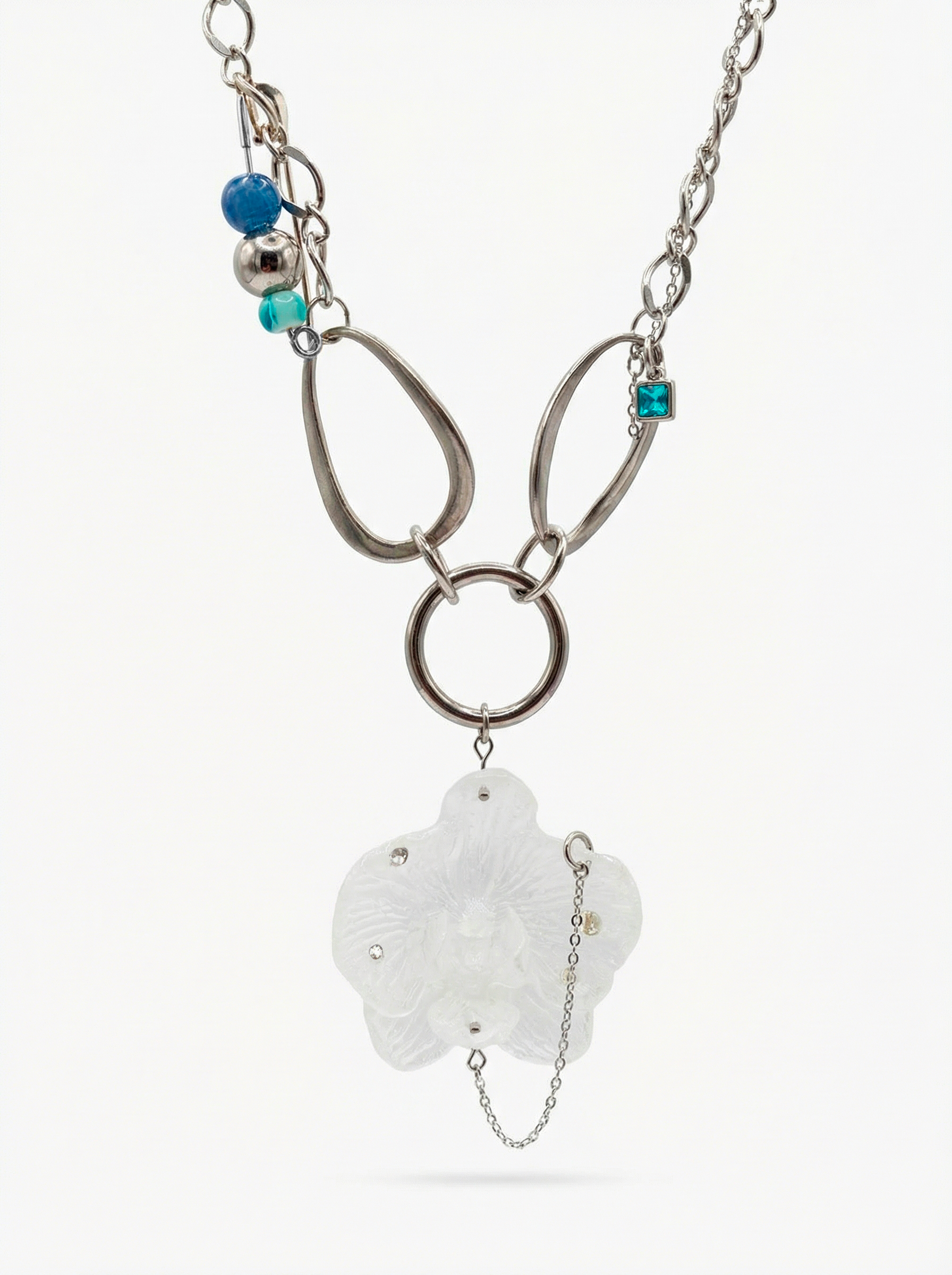 Matériaux : chaîne en acier inoxydable, orchidée en résine, charme en acier inoxydable, perles en céramique et acier inoxydable.