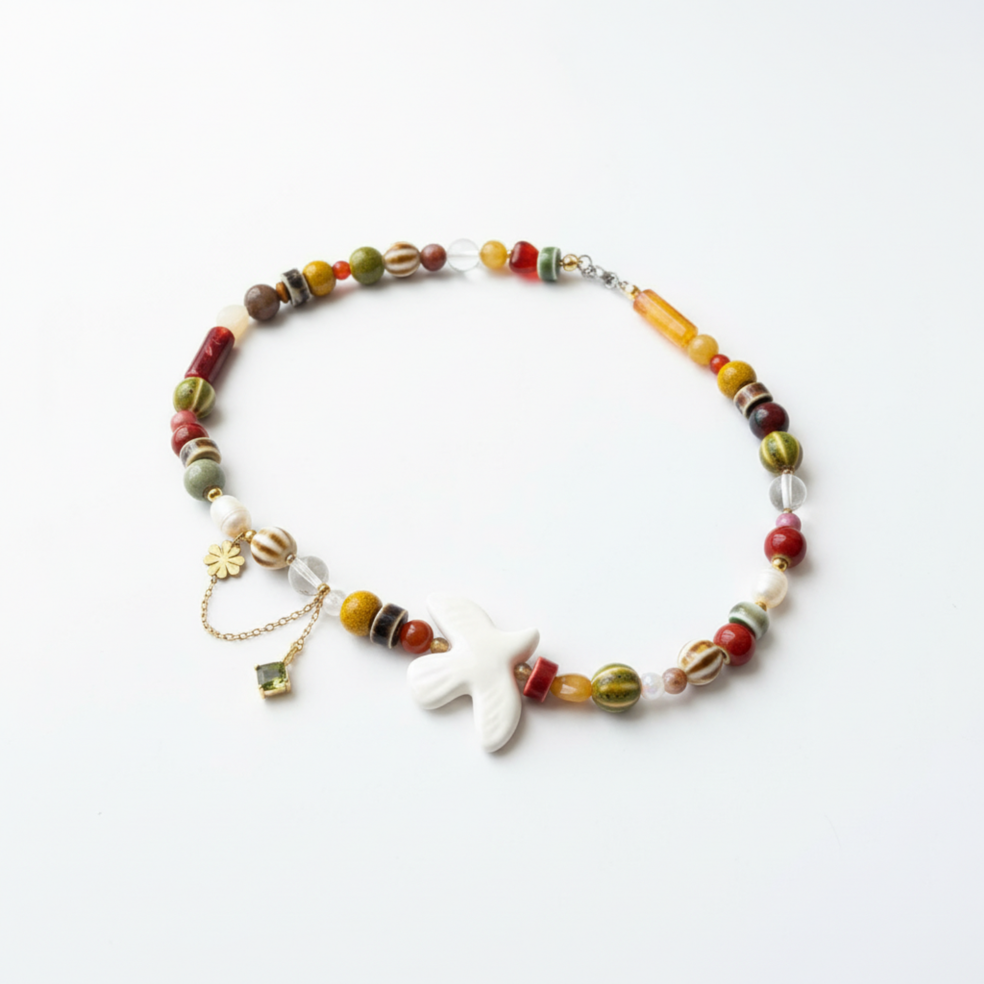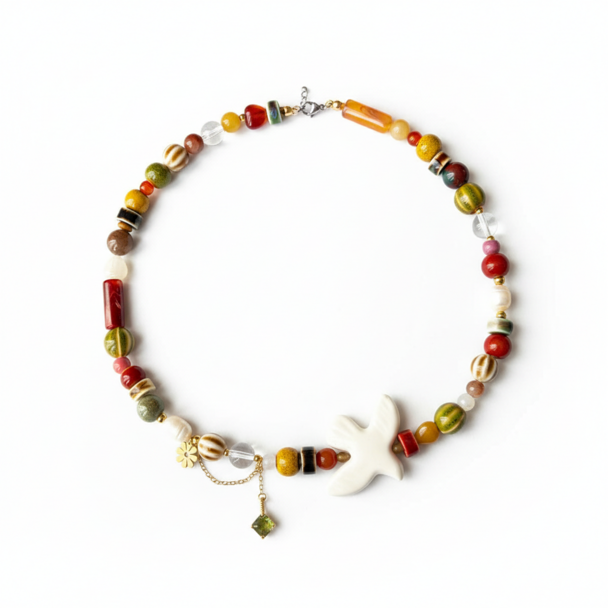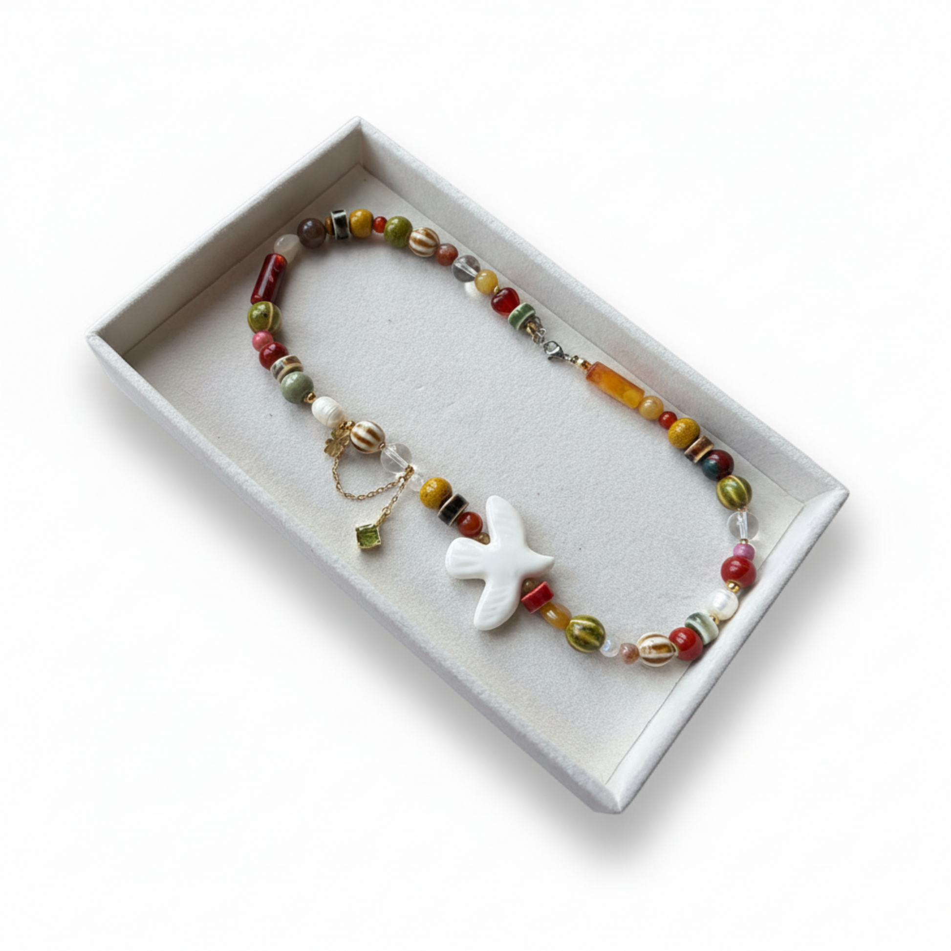 Matériaux : perles en céramique, perle d'eau douce, en verre, pierre naturelle et résine. Charmes en acier inoxydable.